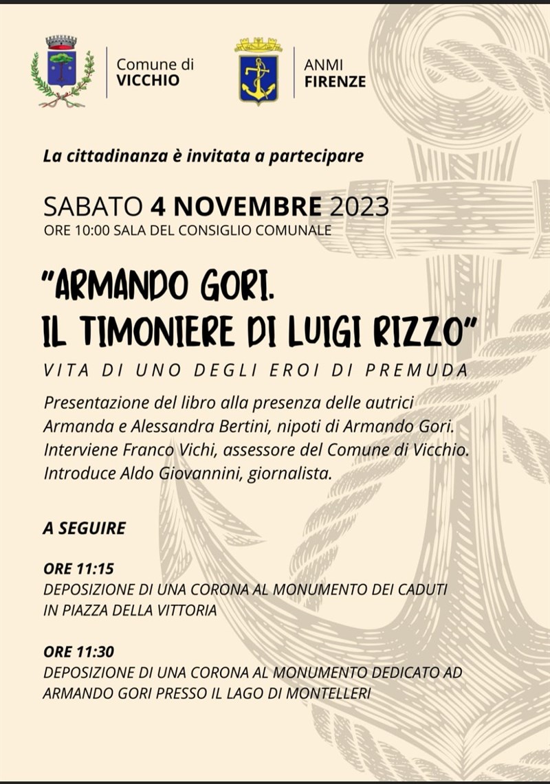 Armando Gori è stato uno dei protagonisti dell’impresa di Premuda il 10 giugno del 1918: nel suo ruolo di timoniere e comandante del MAS 15, agli ordini del capo sezione Luigi Rizzo, diede un contributo essenziale all’affondamento della corazzata austroungarica Santo Stefano, imprimendo una svolta decisiva all’andamento della guerra a favore dell’Italia. Alessandra e Armanda Bertini, nipoti di Armando, entrambe ex insegnanti, hanno scritto la sua biografia dal titolo “Armando Gori il timoniere di Luigi Rizzo – Vita di uno degli eroi di Premuda”, sulla base di un grande archivio familiare in loro possesso. In essa raccontano tutta la sua esistenza, l’infanzia nelle campagne vicchiesi, la formazione nella Marina Militare, i viaggi in terre lontane (Africa, Estremo Oriente, Sudamerica), le imprese (la guerra di Libia, la Prima guerra mondiale, l’inizio della la Seconda, prima di essere fatto prigioniero a Massaua), gli ultimi difficili anni di prigionia in India e poi quelli del dopoguerra a Genova, la vita privata, con particolare attenzione ai suoi legami con Vicchio, dove si trova la sua casa natale con la lapide degli anni ’20 (che lo definisce “Ultore di Lissa a Premuda”), e dove ha scelto di essere sepolto, nel piccolo cimitero di Gattaia, nel 1975, a cura del Comune e dell’ANMI di Firenze, è stato eretto un semplice monumento a forma di ancora sulle rive del lago di Montelleri.