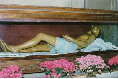 Foto 2 (qui sopra): Il Cristo Morto in ceroplastica di Clemente Susini, che si venera fin dai primi dell’800 all’interno della Pieve di Santa Maria a Fagna; altra similare, quasi gemellare opera in ceroplastica di Clemente Susini si venera all’interno dell’ Oratorio di San Filippo Neri della Misercordia di Vicchio di Mugello.