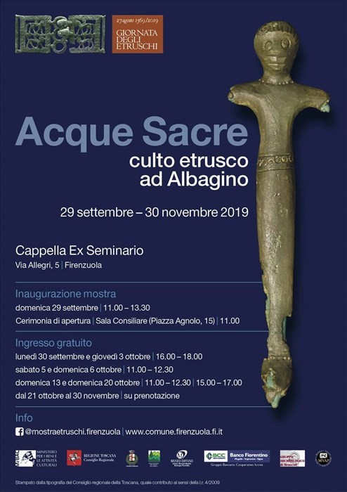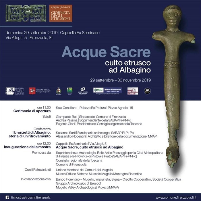 A Palazzuolo vengono esposte due tombe di guerrieri, di cui sono stati ricostruiti i corredi ed effettuati i restauri grazie all'impegno del Gruppo Archeologico dell'Alto Mugello e il contributo di aziende e cittadini di Palazzuolo. L'altra esposizione presenta un gruppo di 16 bronzetti etruschi, databili tra VI e IV secolo a.C. Già esposti nel 2017-2018 per le Giornate degli Etruschi al Palazzo del Pegaso a Firenze, insieme a ritrovamenti etruschi del Lago degli Idoli del Falterona, per la prima volta vengono portati a Firenzuola, nel cui territorio in località Albagino sono stati ritrovati nel 2016 dal Gruppo Archeologico di Bruscoli e consegnati alla Soprintendenza di Firenze.