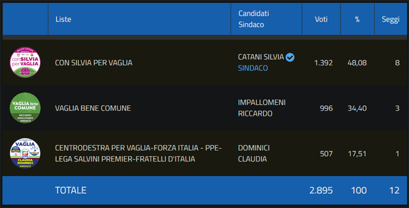"CON SILVIA PER VAGLIA", guidata da Silvia Catani, ha ottenuto 1.392 voti, corrispondenti al 48,08% dei voti, assicurandosi 8 seggi.