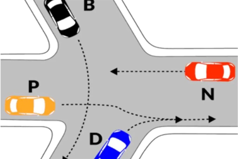Considerando un incrocio in cui convergono quattro veicoli senza alcun segnale di precedenza, la valutazione corretta è la seguente: il primo veicolo a passare è quello che ha libera la destra, ovvero il mezzo indicato con la lettera D (auto blu nell’esempio). Successivamente, libera la destra per il veicolo P (auto gialla), che quindi prosegue per secondo. Infine, transitano nell’ordine i veicoli con le lettere B e N, quest’ultimo ultimo a liberare l’incrocio.