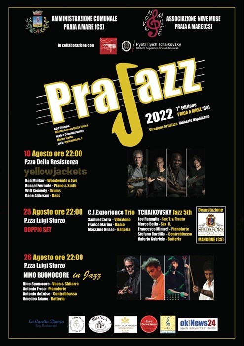 Grande attesa sull’alto Tirreno Cosentino per la settima edizione del PRAJAZZ, evento ideato e coordinato del Pianista/Compositore Umberto Napolitano, con il contributo dell’amministrazione comunale di Praia a Mare guidata dal Sindaco Antonino De Lorenzo, in collaborazione con il Peperoncino Jazz Festival ed il Conservatorio di Musica P.I. Tchaikovsky di Catanzaro. Il festival, giunto alla sua settima edizione riprende con l’esibizione dei “Yellow jackets” il 10 agosto 2022 presso Piazza della Resistenza, Praia a Mare. Quando presentiamo i Yellowjackets, parliamo - e in questo caso scriviamo - della più longeva e creativa band sia dal punto di vista anagrafico che di sperimentazione musicale. Scelta che, volta dopo volta, si unisce alla ormai consolidata unione di gruppo che rende il loro repertorio del tutto unico e irripetibile.