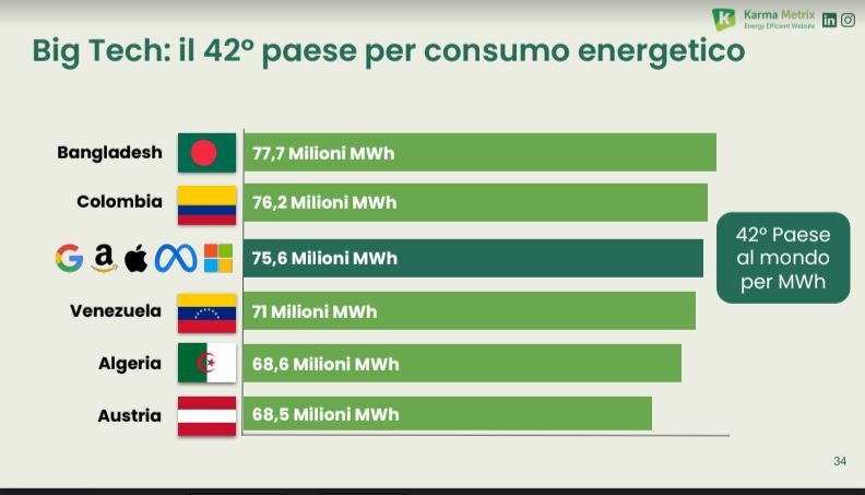 Il dato clamoroso dell'impatto sull'atmosfera non è solo. Le cinque grandi aziende hanno consumato energia per 75,6 Milioni di MWh, ovvero più di nazioni come Austria, Algeria e Venezuela.