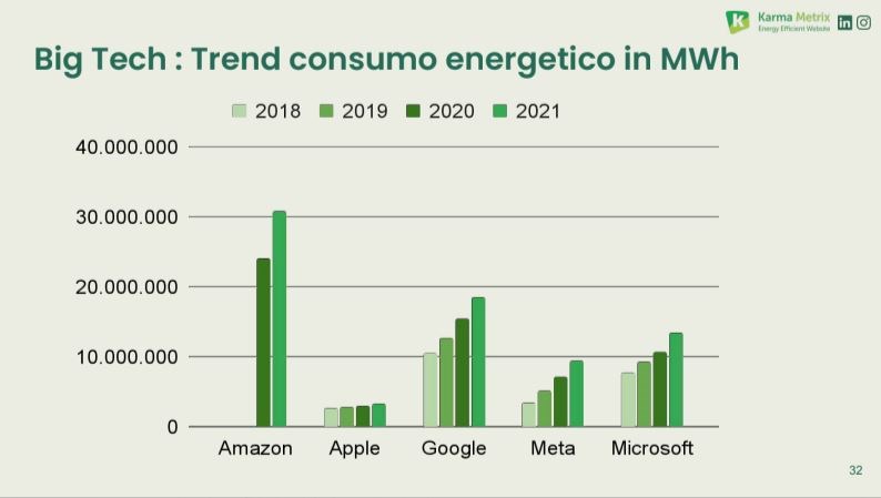 In generale, il consumo di energia delle 5 Big Tech in milioni di MWh è aumentato del 209.5% dal 2018 al 2021 (ultimo anno in cui sono disponibili i bilanci di sostenibilità per tutte). L’Osservatorio, che ha analizzato sia i dati aggregati sia quelli delle singole aziende è il primo percorso di sostenibilità digitale per grandi brand sensibili sui temi della sostenibilità digitale.