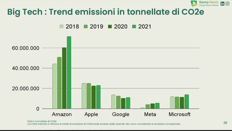 Dai dati emerge che nell’ultimo anno i 5 colossi della tecnologia hanno emesso 125,9 milioni di tonnellate di CO2e, ovvero più dell’intero Belgio (125,4), con un aumento delle emissioni totali del 30,8% dal 2018 al 2021.