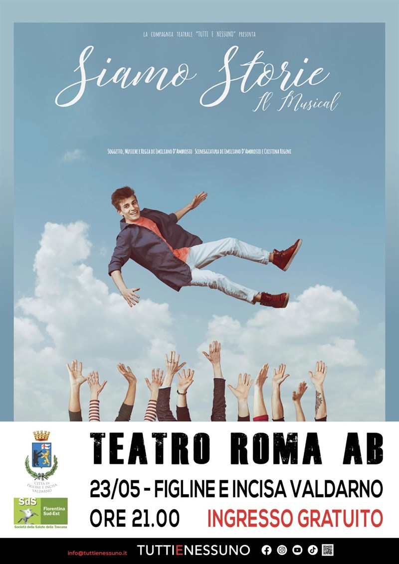Il primo dei due appuntamenti finali si terrà venerdì 23 maggio alle ore 21, presso il Cinema Teatro Roma AB di Figline Valdarno (via Roma 18). In scena andrà lo spettacolo “Siamo storie. Il musical”, realizzato dalla compagnia teatrale “Tutti e Nessuno”, con soggetto, musiche e regia di Emiliano D’Ambrosio e sceneggiatura firmata da D’Ambrosio e Cristina Regeni.