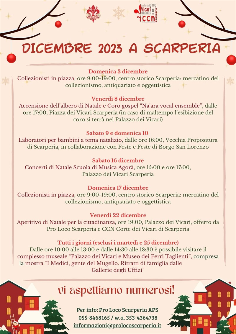 A Scarperia la locale Pro Loco ha organizzato una serie di eventi, un  calendario molto ricco da non perdere durante il mese di dicembre. Eventi per tutti i gusti: collezionismo, musica, attività per bambini, mostre e brindisi: ecco come trascorrere l'ultimo mese del 2023.Si parte domenica 3 dicembre con i collezionisti in piazza dalle ore 9 alle 19, antiquariato, collezionismo e oggettistica. In collaborazione con il CCN Corte dei Vicari di Scarperia. tutti i giorni, escluso il martedi e il 25 dicembre è possibile visitare il complesso museale "Palazzo dei Vicari e il Museo dei ferri Taglienti dalle ore 10 alle 13 e dalle 14,30 alle 18,30.