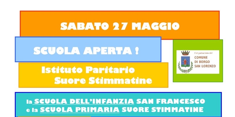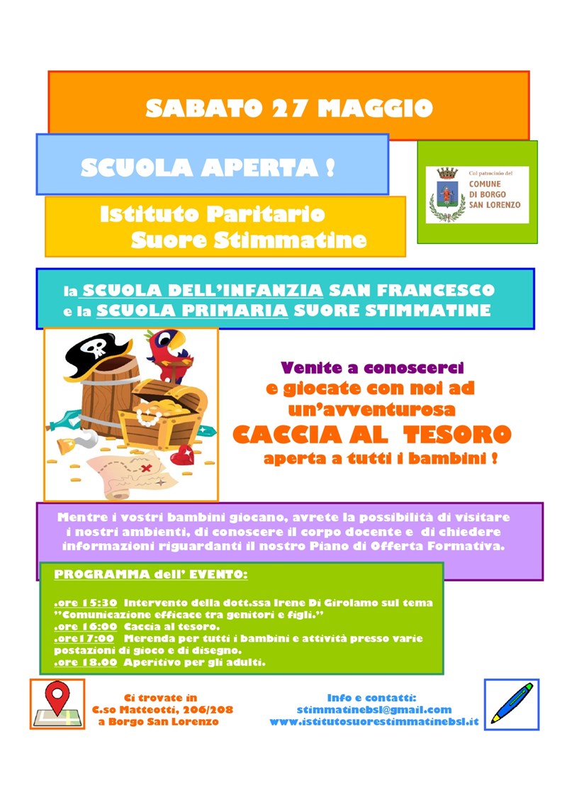 Portiamo gentilmente a conoscenza che sabato prossimo 27 maggio 2023, con il patrocinio del comune di Borgo San Lorenzo, ci sarà una giornata denominata “Open Day - Scuola Aperta!”, presso l’Istituto Paritario, della scuola dell’infanzia San Francesco e della scuola primaria, delle Suore Stimmatine in Corso Matteotti, 206/208. Ecco il programma della giornata: ore 15,30: intervento della dott.ssa Irene Di Girolamo sul tema: “Comunicazione efficace tra genitori e figli”; ore 16, “Caccia al Tesoro”; ore 17 merenda per tutti i bambini e attività presso varie postazioni di gioco e di disegno; ore18, aperitivo per gli adulti.