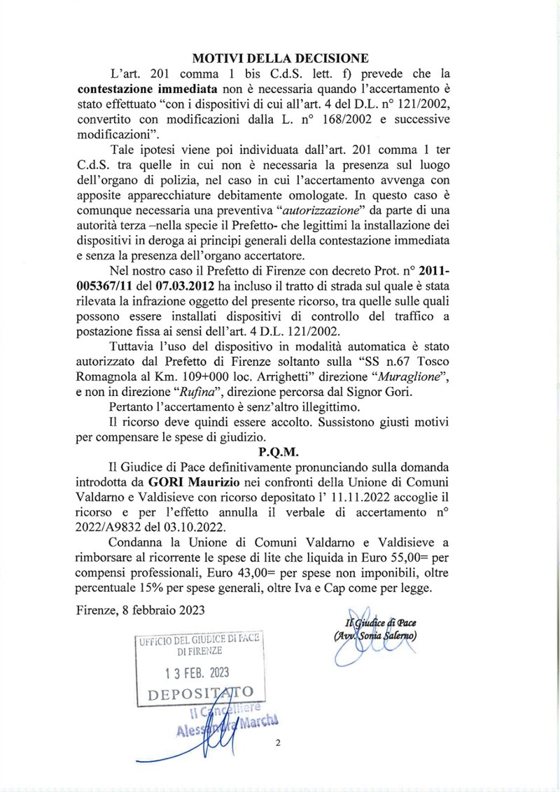 Sono molteplici, a mio avviso, le ragioni che avrebbero reso illegittime le sanzioni. Il Giudice di Pace di Firenze ha subito accolto la prima fra tutte, assorbendo con questa tutte le altre: l’assenza del Decreto Prefettizio di autorizzazione per il senso di marcia direzione Rufina"